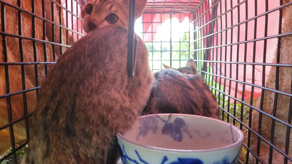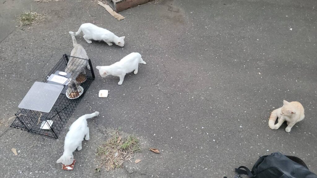 翌日、いざ捕獲へ!まずは体の小さい子を優先的に保護。さらに人に慣れているメス猫さんたちを中心に捕獲を進めます。ただ、まだカメラでの全体調査が完全には終わっていなかったため、あえて2匹を残してご飯をあげてもらうことにしました。取り逃しがないよう、慎重に調査を続けるためです。