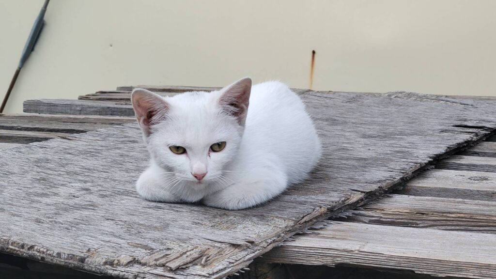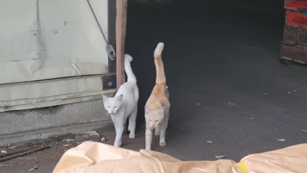 倉庫の白猫さんは餌やりさん宅から流れ着いた子たち