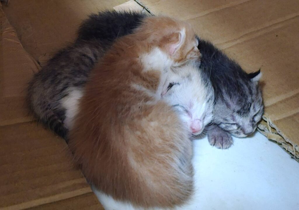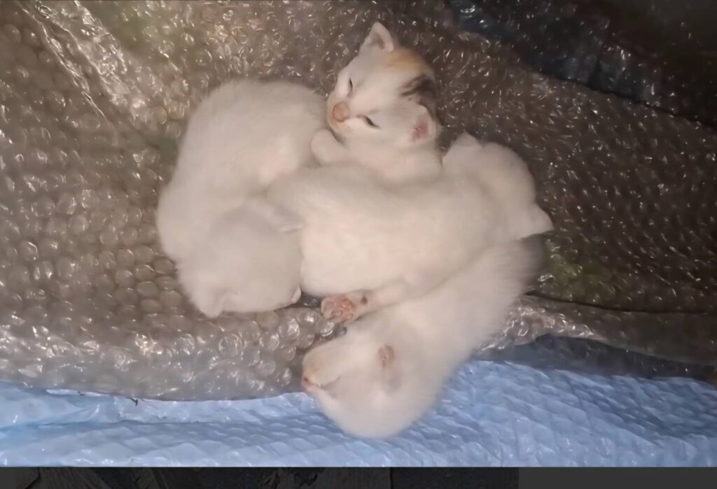 それを見た方が知り合いのボランティアさんに連絡し、ボランティアさんが生後数週間の子猫さん4匹を無事に保護しました。まだ目も耳も開いていない本当に生まれてすぐです。
