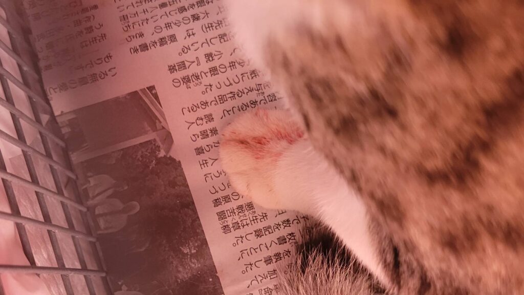 捕獲器は釣り針式捕獲器で、捕獲時にびっくりした猫さんは、釣り針で左手にケガを負っていました!