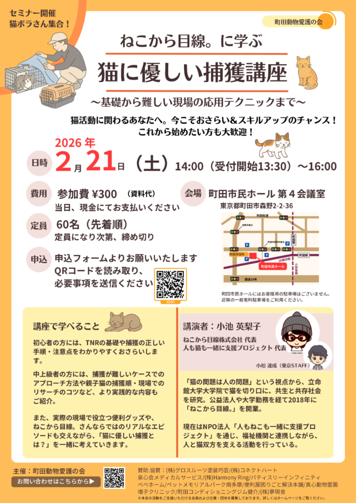 猫の日直前の来年2月21日(土)に、東京都町田市で『猫に優しい捕獲講座』が町田動物愛護の会さん主催で開催されることになりました!