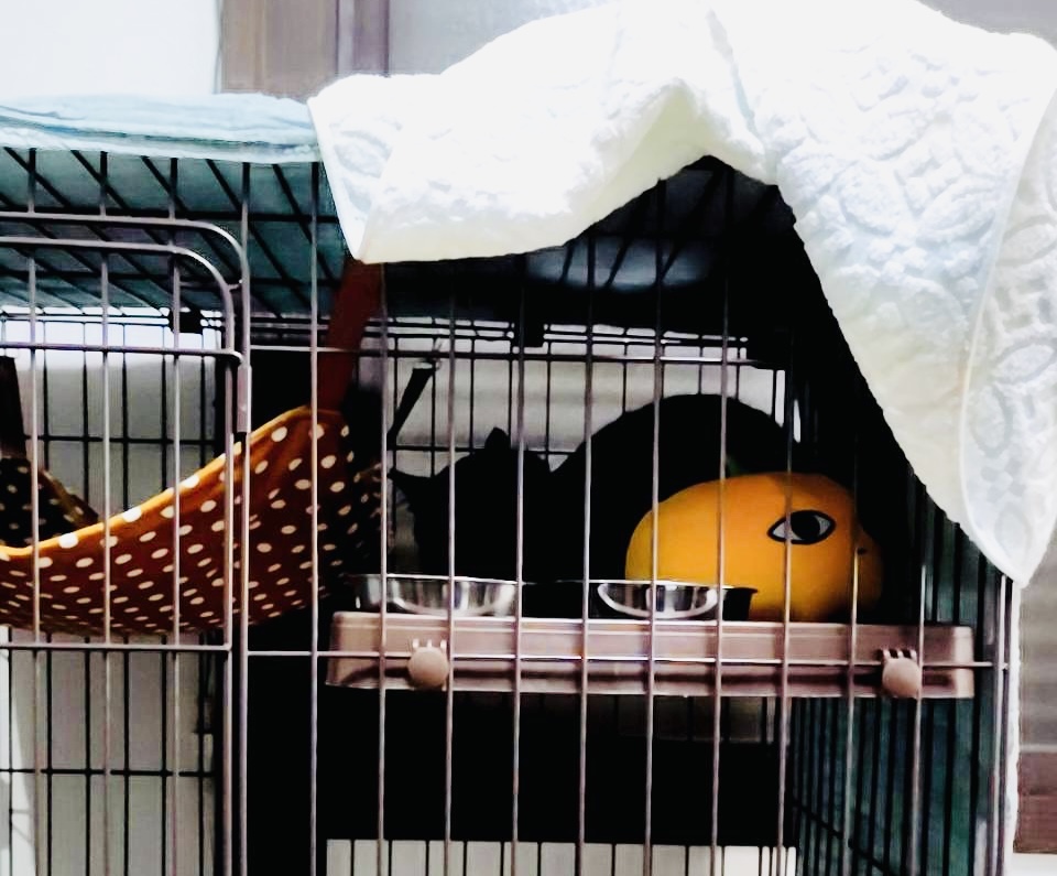 特に動きがない中、夜中に目が覚めたご主人、何だか寂しそうな雰囲気を察し、ケージをオープンすると、するりと出てきて、二人でゴロゴロしながら遊んでいたそう。