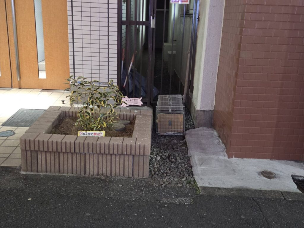 車の下や小屋の中と同じように薄暗くなる、大きな柱の影を選んで捕獲器を設置しました。