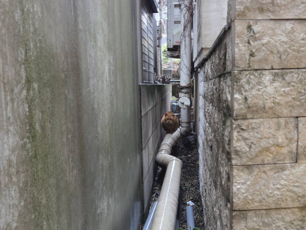 前回保護したキジトラさんのいた路地から、ほんの少し離れた場所、線路のフェンスとホテルの壁に挟まれた、細い路地裏が、ココちゃんの生活スペースでした。
