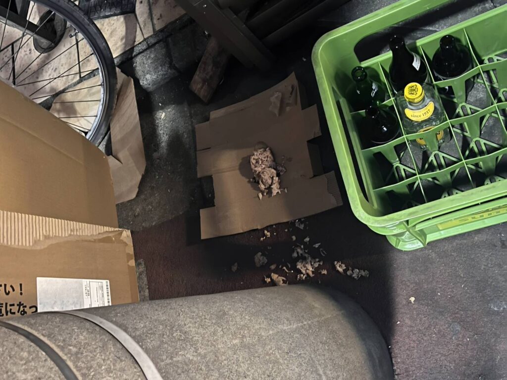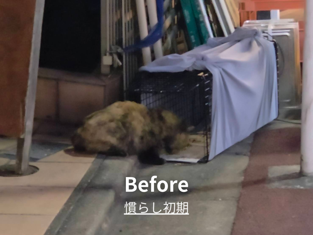 隣の飲食店の店長さんも、置き餌には以前から困っていたとのこと。餌づけは決まった時間に行い、食べ終わったら必ず掃除すること、そして隣のマンションの方も協力してくださっていることを丁寧にお伝えすると、「保護されて置き餌がなくなるなら」と許可してくださいました。