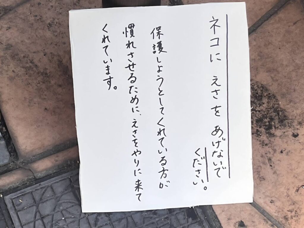 商店街のど真ん中という場所柄、地面にばらまかれた置き餌にカラスが集まることもあり、野良猫へのご飯やりを快く思わない方もいます。