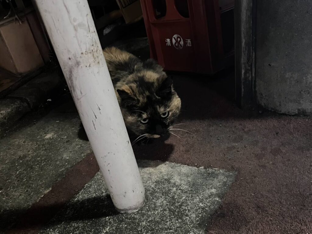 サビ猫さんがいるのは、マンションと居酒屋の間の小さなスペース。大きな声でご飯を催促するサビさんに、通りすがりの方もつい置き餌をしてしまうようで、決まった餌やりさんもいませんでした。