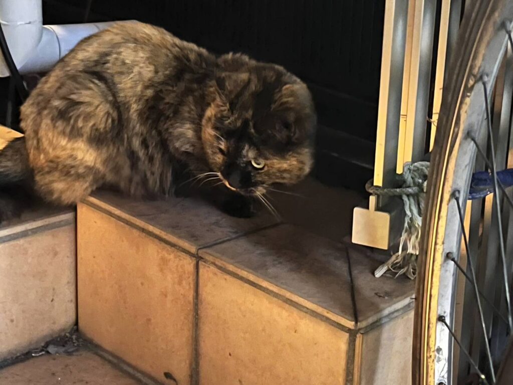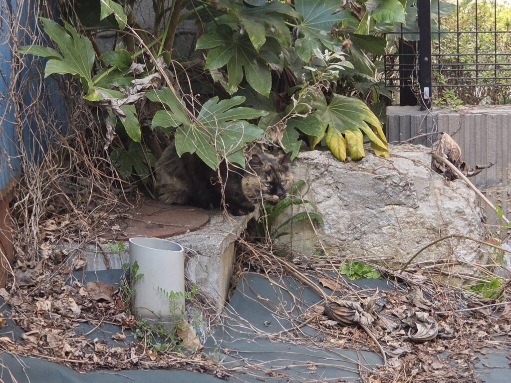 翌日、念のため昼から現場に向かい準備をしていると、人の気配を察してか「ミ゛ャオ」と姿を現したサビさん。商店街の裏にある空き地で日向ぼっこでもしていたのでしょうか。