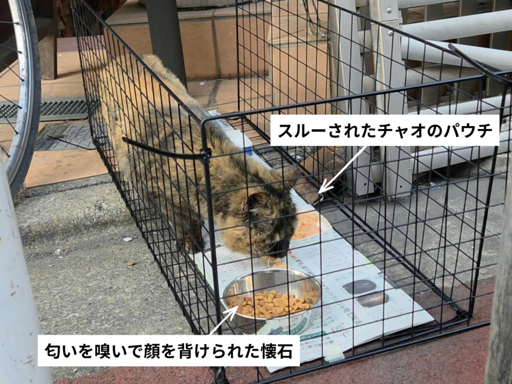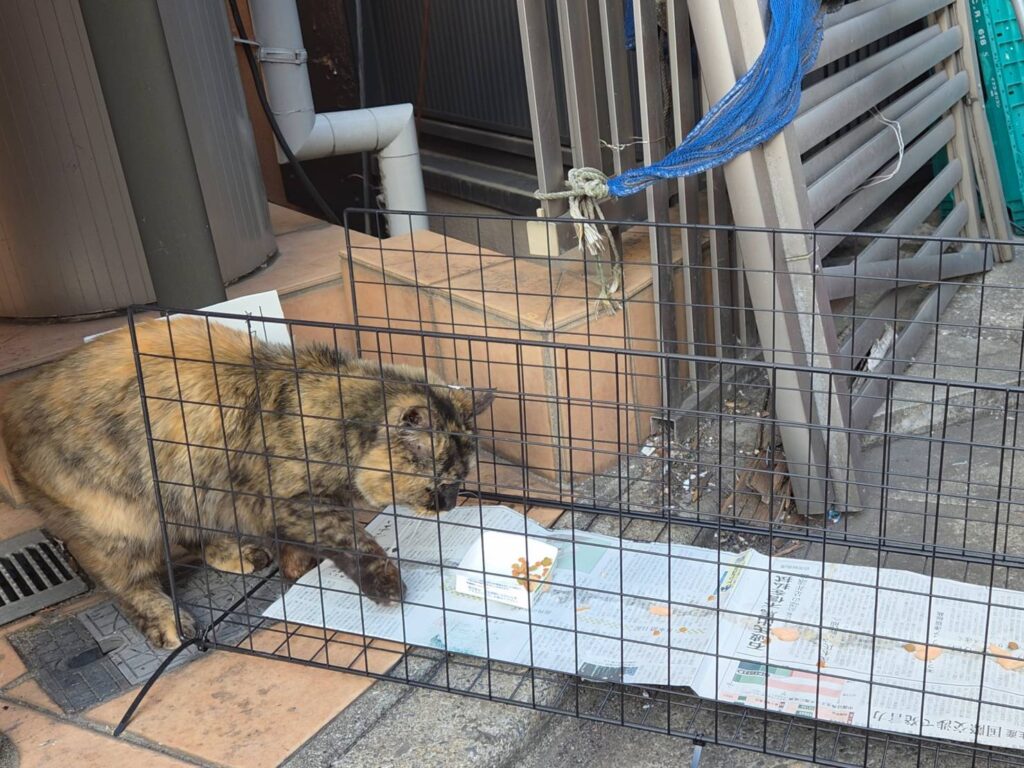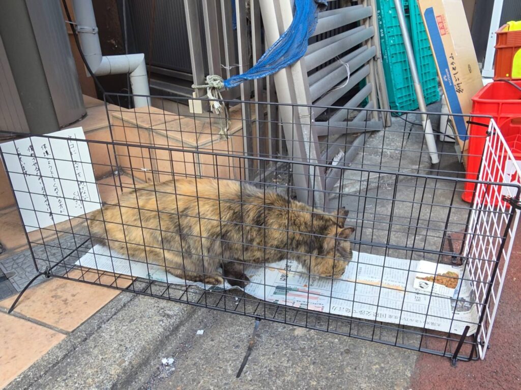 ご飯をあげていたお兄さんに話を聞くと、1週間ほど前からここに現れるようになったとのこと。サビさんの行動がバラつきはじめた時期とぴったり重なります。事情を説明すると、お兄さんも快く協力してくださることに。慣らしの為に用意していた捕獲器を持ってくると、警戒しながらも何とか奥まで入ってくれました。